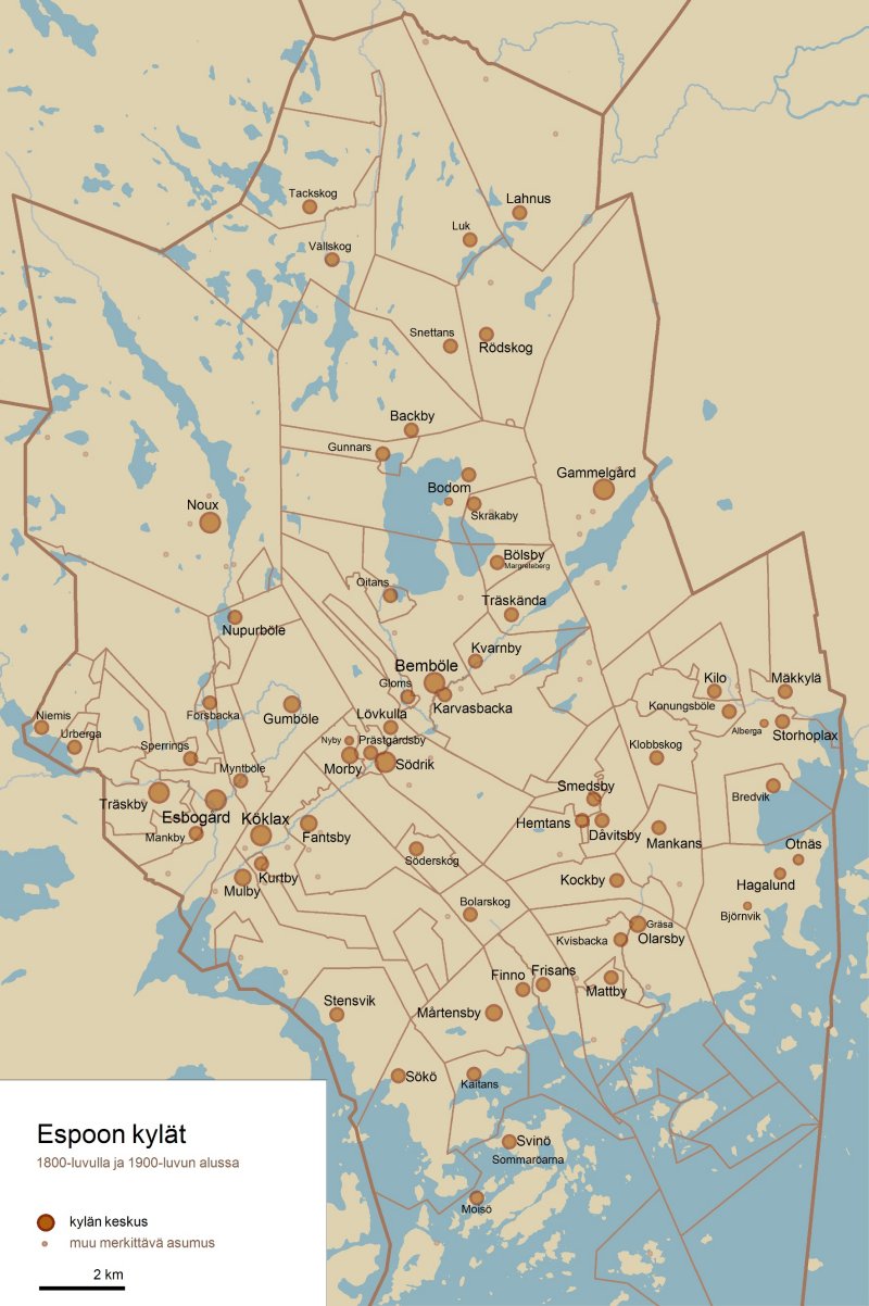 Maalaiskuntien piirijakoasetus 1898Kuntien hitaus kansakoulujen perustamiseen vapaaehtoisuuden pohjalta alkoi arveluttaa kansakouluaatteen puolestapuhujia. Ehdotus yleisen oppivelvollisuuden käytäntöön ottamisesta oli ensimmäisen kerran esillä vuoden 1897 valtiopäivillä, sitä ei kuitenkaan silloin vielä kannatettu. Sen sijaan säädyt hyväksyivät piirijakoasetuksen, jonka mukaan maalaiskunta oli velvollinen jakamaan alueensa koulupiireihin siten, että jokaisella kouluikäisellä olisi tilaisuus saada kansakouluopetusta omalla äidinkielellään ja että kuntien alueet on jaettu piireihin siten, että harvaan asuttuja seutuja lukuun ottamatta, koulumatkat eivät muodostuisi viittä kilometriä pitemmiksi. Jakoehdotus piti alistaa kuvernöörin vahvistettavaksi. Jos piirissä oli 30 kouluikäistä lasta, koulu oli perustettava välittömästi. Mikäli koulussa oli yli 50 koululaista, kouluun oli perustettava toisen opettajan virka tai piiri oli jaettava. Tämän uuden asetuksen mukaan kaikki ylemmät kansakoulut tulivat kuulumaan kunnan yhteisen hallinnon alaisuuteen. Piirijako piti toteuttaa kolmen vuoden sisällä. Espoon ensimmäinen koulupiirijakoEspoossa asetettiin komitea vuoden 1899 lopulla laatimaan piirijakoehdotusta, joka valmistui alkuvuodesta 1901. Komitea ehdotti yhdeksää ruotsinkielistä koulupiiriä, jolloin kunnassa olisi keskimäärin yksi kansakoulu 79 ruotsinkielistä lasta kohti. Ehdotuksen mukaan seitsemän piiriä oli suunniteltu olemassa olevien viiden yksityisen kansakoulun ja kahden kunnan rakentaman koulun ympärille. Jaon perusteella ainoastaan Mankkaan ja Träskbyn piiristä puuttuivat koulut, mutta niidenkin koulusuunnitelmat olivat jo alulla. Espoon kuntakokous päätti piirijaosta helmikuussa 1901 jakaen Espoon komitean ehdotuksen mukaisesti yhdeksään ruotsinkieliseen koulupiiriin. Suomenkielisten lasten koulunkäynnin turvaamiseksi kuntakokous päätti komitean ehdotuksen mukaisesti muodostaa koko Espoon kattava yksi suomenkielinen koulupiiri. Samalla kuntakokouksessa pidettiin välttämättömänä, että suomenkielinen kansakoulu sijoitetaan mahdollisimman keskelle pitäjää ja lähelle kirkkoa. Näin siksi, että suomalaiset asuivat hajallaan eri puolilla pitäjää. Ruotsinkieliset koulupiirit1. koulupiiriin kuuluivat Alberga, Bergans, Bredvik, Kilo, Mäkkylä ja Klobbskog sekä osa Bembölen kylästä. Piirissä oli valmiina yksityinen Albergan koulu, joka siirtyi kunnalle 1893. 2. koulupiiriin kuuluivat Mankkaa, Hagalund, Smedsby, Hemtans, Dåvitsby, Kockby, Gräsagård ja Mattby. Piirijakoa suunniteltaessa toukokuussa 1899 alueen kansakoulun perustamisehdotus oli jo ollut kuntakokouksen käsittelyssä. 3. koulupiiriin kuuluivat Frisans, Finnå, Martensby, Svinö, Moisio, Löfö ja osittain Sökö. Piirin koulutarpeen täytti yksityinen Mataskärin koulu. 4. koulupiiriin kuuluivat Stensvik, osa Kauklahtea, Mulby, Bastvik, Kalvik ja Stenbacka. Piirissä oli Stensvikin yksityinen koulu. 5. koulupiiriin kuuluivat Träskby, Espoonkartano, Mankby, Niemis, Urberga, Forsbacka, Sperrings, Myntböle, Mulby, Åminne ja Jupp, osa Kauklahtea sekä Kurtby . Koulupiiristä puuttui tässä vaiheessa koulu. Koulun paikaksi ehdotettiin Träskbytä. 6. koulupiiriin kuuluivat Nuuksio, Nupurböle, Hackjärvi ja Gumböle. Piiriin oli juuri valmistunut kunnallinen Nuuksion kansakoulu. 7. koulupiiriin kuuluivat Bolarskog, Söderskog, Södrik, Pappilankylä, Morby, Löfkulla, Gloms, Oitans, Bemböle, osittain Karvasbacka ja Fannsby. Lagstadin kansakoulun katsottiin tyydyttävän tämän alueen koulutarpeet. 8. koulupiiriin kuuluivat Träskända, Margretebärg, Dalsvik, Kvarnby, Gloms, Oitans, ja osittain Bemböle. Alueen keskustassa sijaitseva Aurora Karamzinin perustama Träskändan koulu oli piirin koulu. 9. koulupiiriin kuuluivat Rödskog, Snettans, Bodom, Backby, Tackskog Velskog, Luukki ja Lahnus. Piirissä oli valmiina hiljan valmistunut Rödskogin eli Röylän kunnallinen kansakoulu.